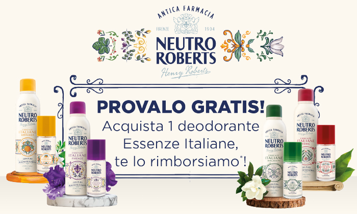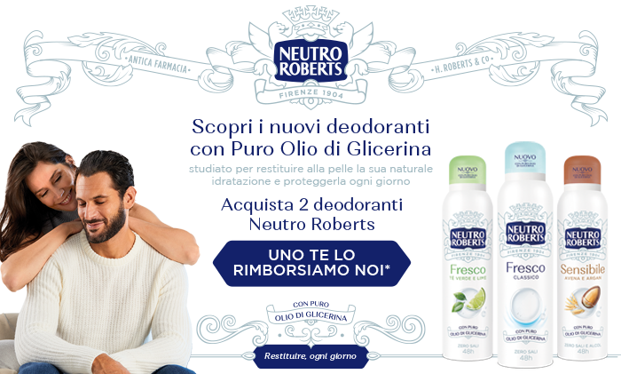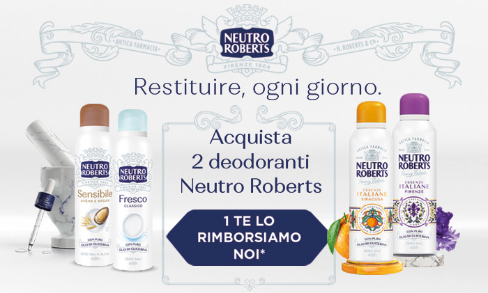 Acquista almeno n.2 Deodoranti Neutro Roberts, tra quelli coinvolti nella promozione, e chiedi il rimborso*. *Puoi chiedere un solo rimborso del prodotto meno caro. Per rimborso massimo, periodi di adesione ed info leggi il Termini&Condizioni