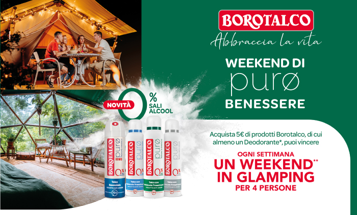 Acquista almeno 5,00 euro di prodotti BOROTALCO oggetto dell’iniziativa – di cui obbligatoriamente almeno n. 1 DEODORANTE tra quelli riportati nel regolamento e prova a vincere ogni settimana un Soggiorno Glamping.