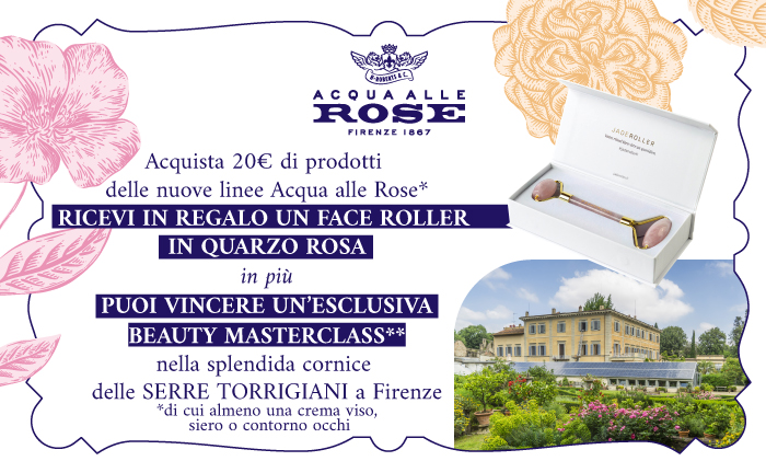 Acquista almeno 20,00 euro di prodotti ACQUA ALLE ROSE a scelta tra quelli riportati nel Regolamento - di cui obbligatoriamente almeno n. 1 CREMA VISO o n. 1 SIERO o n. 1 CONTORNO OCCHI – e richiedi il Faceroller. Parteciperai anche all'estrazione finale di una Masterclass