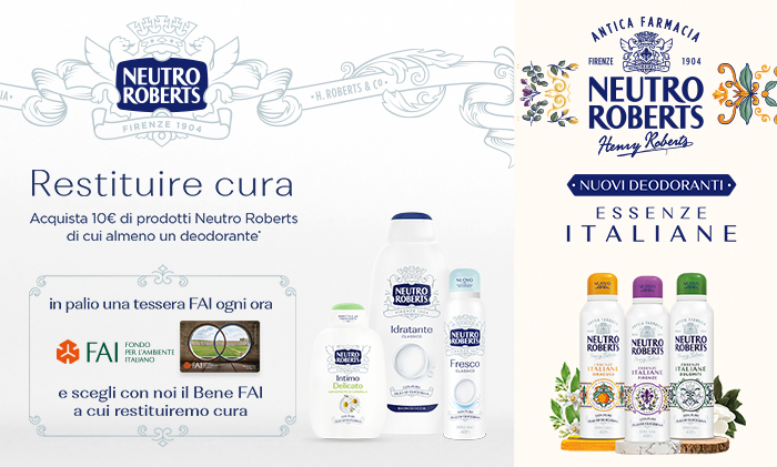 Acquista almeno 10,00 euro di prodotti NEUTRO ROBERTS – di cui obbligatoriamente almeno n. 1 DEODORANTE (Tabella A) – e prova a vincere una Tessera FAI.
