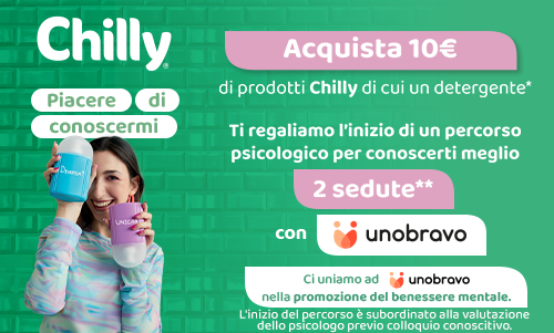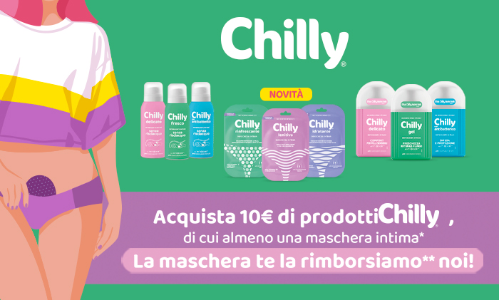 Acquista almeno 2 prodotti Chilly coinvolti (tra cui un detergente intimo) presso i punti vendita che espongono il materiale pubblicitario/volantino e richiedi il rimborso pari all'importo speso per l'acquisto degli stessi, fino ad un max di € 10,78