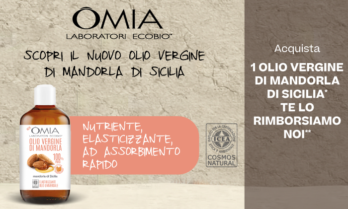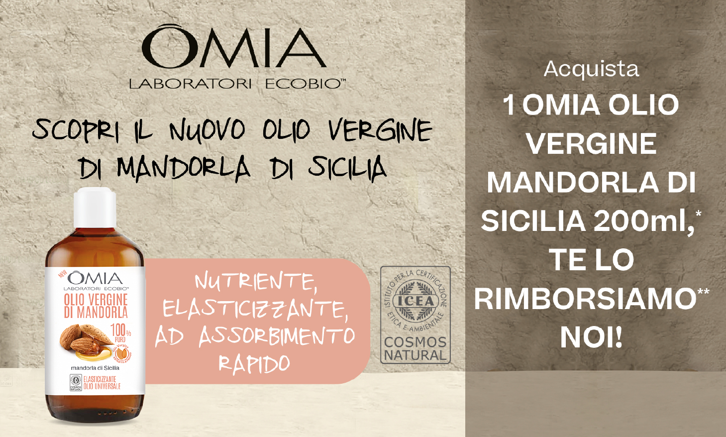 Acquista con documento d’acquisto “parlante” n. 1 OMIA OLIO VERGINE MANDORLA DI SICILIA 200ml e richiedi il rimborso dell’importo speso fino ad un massimo di 7,99 euro.