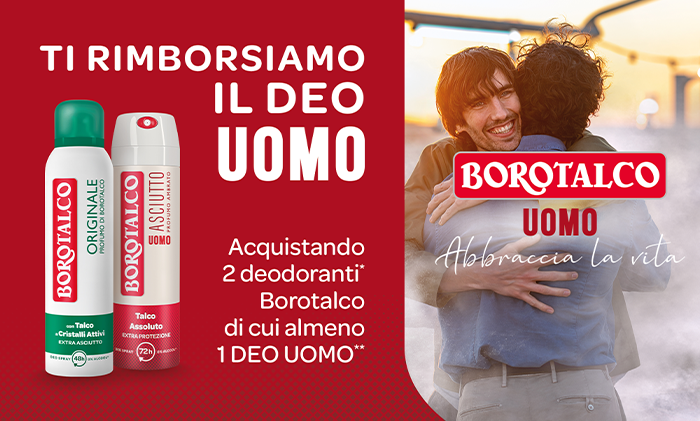 Acquista n. 2 deodoranti BOROTALCO - di cui almeno n. 1 deodorante uomo tra quelli riportati ne Termini &Condizioni. Potrai chiedere il rimborso dell’importo speso per il deodorante uomo, fino ad un massimo di 4,29€. Si precisa che: dal 01/04 al 09/04/25 saranno considerati validi esclusivamente gli acquisti effettuati nei punti vendita “Ipercoop”, “Coop” e “Incoop”, appartenenti al Distretto Coop Nord Ovest - sopra indicati - e nel relativo sito ecommerce.