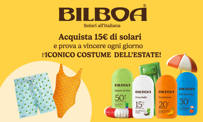 Acquista con unico documento d’acquisto, almeno 15,00 euro di prodotti BILBOA e prova a vincere uno dei costumi dell'estate firmati Bilboa in palio.