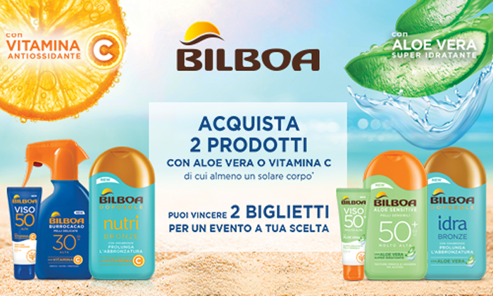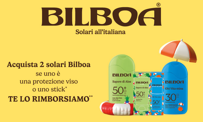 Acquista almeno n. 2 prodotti Bilboa tra quelli coinvolti di cui obbligatoriamente almeno n. 1 solare corpo a scelta della linea Burrocacao o della linea Aloe Sensitive (tabella nel Regolamento).