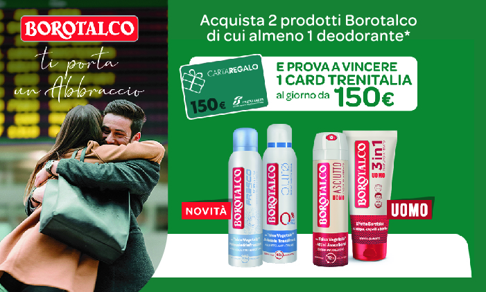 Acquista 2 prodotti Borotalco, di cui almeno 1 deodorante, e prova a vincere 1 card Trenitalia.
