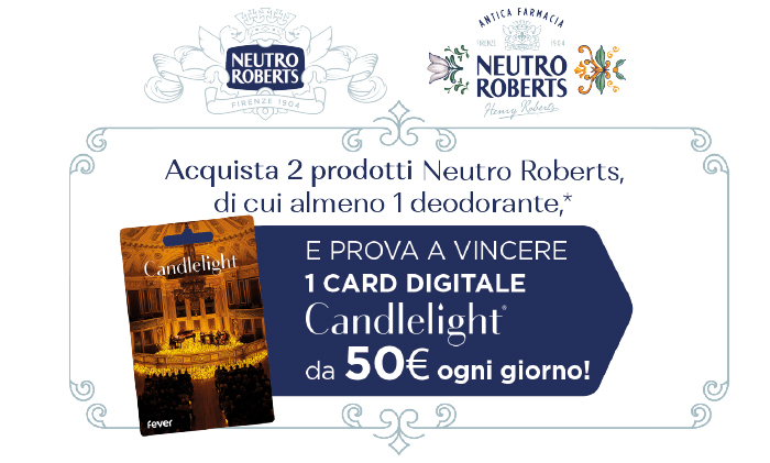 Acquista n. 2 prodotti a marchio NEUTRO ROBERTS, di cui obbligatoriamente almeno n. 1 DEODORANTE tra quelli riportati nel Regolamento e prova a vincere una delle Gift Card digitali Candlelight in palio.