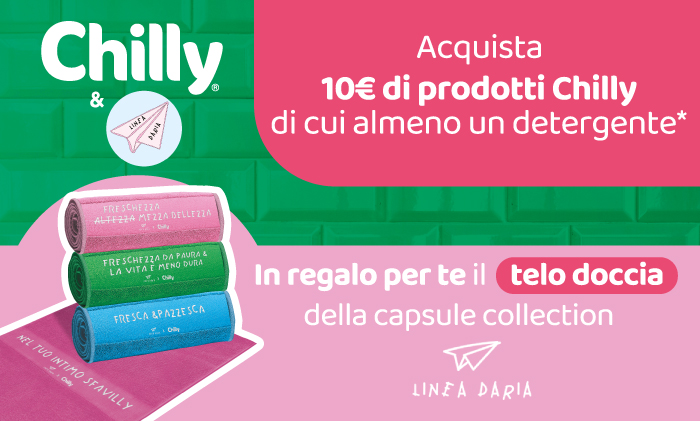 Acquista almeno 10,00 queo di prodotti Chilly - di cui almeno n. 1 DETERGENTE tra quelli riportati nel reoglamento, in regalo per te un telo doccia brandizzato