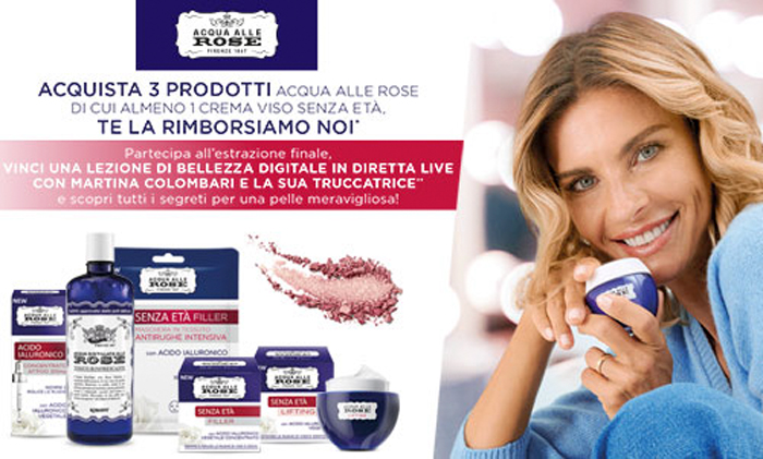Acquista nei punti vendita che espongono il materiale promozionale almeno n. 3 prodotti coinvolti “Acqua Alle Rose”, di cui n. 1 prodotto tra quelli indicati nella Tabella del Termini & Condizioni per richiedere il rimborso** di quest'ultimo e partecipa all'estrazione finale di 5 voucher digitali per una lezione online di beauty routine con Martina Colombari e la sua truccatrice***.