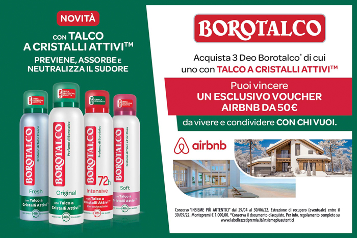 Acquista n. 3 Deo Borotalco* di cui uno con TALCO A CRISTALLI ATTIVI puoi vincere UN ESCLUSIVO VOUCHER AIRBNB DA 50€ da vivere e condividere CON CHI VUOI.