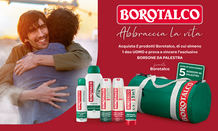 Acquista 2 prodotti borotalco di cui almeno 1 deo UOMO e prova a vincere l'esclusivo borsone da palestra firmato Borotalco